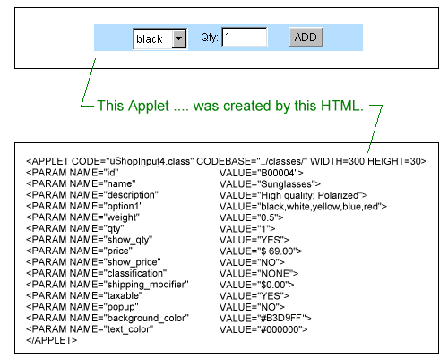 6. Setting Up Store Pages/Applets Upon setting up your directory structure on your local computer, you can begin creating your store's product pages. This process simply involves using any text or HTML editor to create your product pages. The pages should be standard HTML pages (located in any of your "html" directories) that describe your products, display images of your products, and may utilize any additional multimedia capabilities/plug-ins that are supported by the browsers you intend to support. Again because of uShop's flexibility, these pages can have any layout/style that you want. In addition to putting product descriptions on your store's HTML pages, you will also need to have a way to allow customers to select items that they want to purchase and add them to their virtual shopping cart. This is done via the use of uShop's Input Applets and Input JavaScripts. The uShopTM Input Applets and JavaScripts are described in the following two sections. 6.1 Input Applets uShopTM comes with a variety of Input Applets that can be used to "Add" or "Input" items into the shopping cart. These applets have been designed to plug easily onto any web page, thus giving you almost total creative freedom when designing your web pages. That is, you can put any product descriptions, images and/or sounds on your pages - using regular HTML - and then add any of the various uShopTM Input Applets onto the pages as the means for adding the items to the shopping cart. The uShopTM applets are added to your HTML pages via the standard <APPLET> HTML tags and configured via some easy-to-use parameters. The figure below shows an example applet and the HTML used to create the applet.