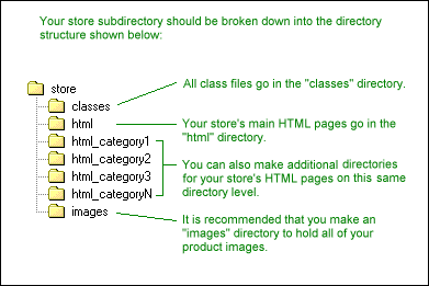Figure 5.1 Recommended Directory Structure Note: You can make as many "html" directories for your store as you like, however, it is important that they are all on the same directory level. That is, put all "html" directories on the same directory level as your "classes" directory. So to sum up what you need to do to create the necessary directory structure for your store, on your development computer: