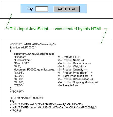 Figure 6.1.1 Example Applet and HTML Note: If you have never used Java applets before and/or would like to see how to utilize the uShopTM applets, it is recommended that you try the uShopTM Tutorial. Need To Create Your Own Custom Input Applets? In order to further increase uShop's flexibility, we have released the Java API for the uShopTM Input Applets. This allows you to create your own custom Input Applets. See the uShopTM Programmer's Guide for more information about creating your own custom Input Applets. An Important Note About The "codebase" Parameter When adding the uShopTM applets to your store pages, you must use the special "codebase" parameter to specify where the Java "class" files are located. As was shown in Figure 6.1.1 above, the "codebase" parameter is specified on the same line as the <APPLET> tag. The value of this parameter should be the relative path to your "classes" directory and must be set to the exact same value for all of your uShopTM applets. So in other words, just remember to set the codebase of ALL of your applets to codebase="../classes/". Note: For more information about the codebase setting, see our codebase reference page at: http://www.uburst.com/uShop/codebase.html 6.2 JavaScripts uShopTM has also provided a special JavaScript Interface Applet and an "Add Product" API (Application Program Interface) that allows you to create your own JavaScripts to interface with uShopTM. Like the uShopTM Input Applets, the JavaScripts can plug onto any web page. Observe the example in the figure below.
