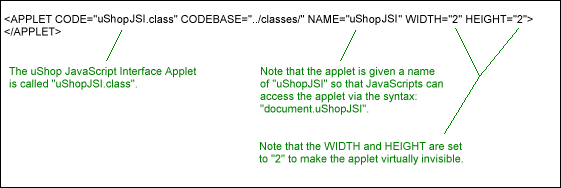 Figure 6.2.2 Example HTML For The JavaScript Interface Applet 7. Special Applets In addition to the various Input Applets that were described in the previous section, uShopTM also provides a variety of other applets that can be used for displaying the contents of the shopping cart, configuring general store preferences, performing searches, offering discounts, and initiating the order process. A brief overview of these applets is provided in the following sections. For a complete description of all of uShop's applets, see the uShopTM Applet Reference. 7.1 Shopping Cart Applets The uShopCart applets provide the means by which you can allow customers to view/modify the current contents of their virtual shopping cart. uShopTM currently has three different "Cart" applets that provide options ranging from showing the full details of each item that has been added to the shopping cart - down to an option to just show the current quantity, subtotal, or total of items in the shopping cart. When setting up your online store, it is recommended that you create at least one HTML page that can be used as a "View Cart" page. On this page, you should put a large version of the uShopCart1 applet so that customers can go to this page at anytime to view the full details of the items currently in his/her virtual shopping cart. If using a "FRAMES" layout for your online store, you may also want to put a smaller version of the cart - perhaps the uShopCart2 applet - in one of the frames. This way, customers can immediately see items get added to their shopping cart when they press the product's "Add" button. See the uShopTM Demonstration Store for a working example of a main "View Cart" page and a working example of a small cart applet in a navigation frame. To find out more about the uShopCart applets and their parameters, see the uShopTM Applet Reference. 7.1.1 Shopping Cart Template In addition to the shopping cart applets described above, there is another shopping cart page that gets displayed once the customer chooses to begin the order process. This additional shopping cart page basically consists of an HTML formatted display of the shopping cart and some instructions to go back and make changes to the order or to continue with the order process. In order to make this page blend with the rest of your store's pages/style, we made a template for this page that you can customize. The template page is called "template_cart.html" and is located in the "classes" directory that was created when you installed/unzipped uShopTM on your local development computer. Feel free to modify the "template_cart.html" file to satisfy your preferences. To assist, a table describing the 3 available keywords has been provided below.
