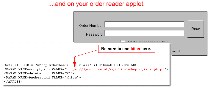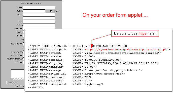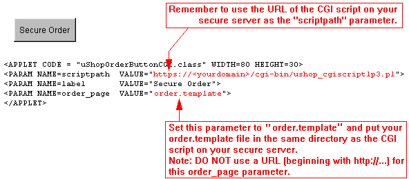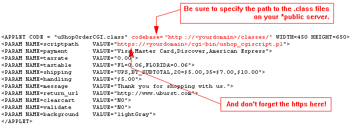 | Update January 19, 2000 regarding Internet Explorer: It appears that due to the way the IE 5.0 is handling the caching of applets, it is not recommended to switch the codebase between your public and secure server pages. That is, apparently IE 5.0 sometimes has trouble reloading the applets on the secure order page if a customer goes back and forth between the regular store pages and the secure order page. The best solution to this problem is that you be sure to use the full URL of the .class files on your PUBLIC server when specifying the codebase of the applets on your secure order page. Note that transactions will still be secure providing you use the secure URL for the "scriptpath" parameter. The diagrams/instructions on this reference page have been updated to reflect this. |